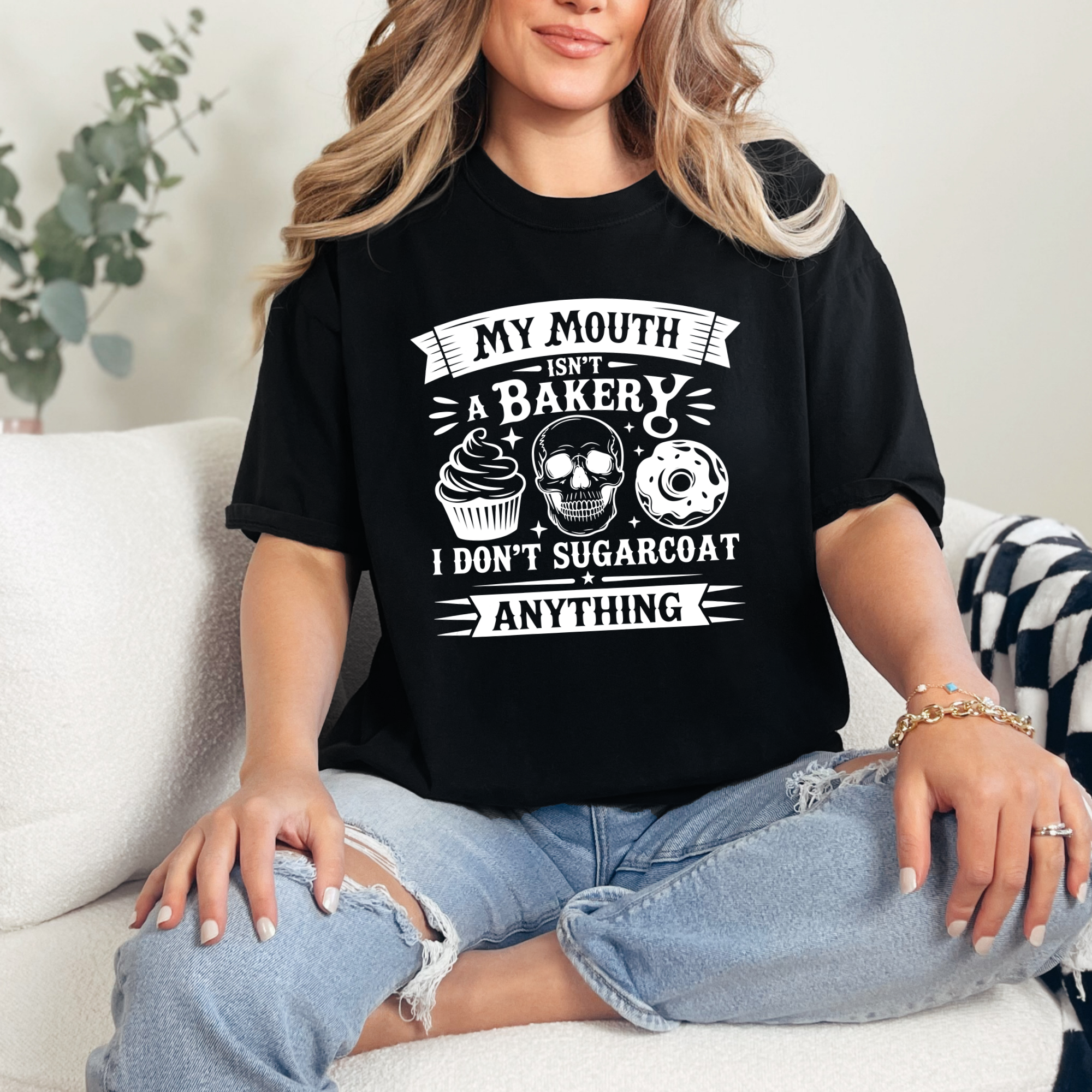 Featuring bold black typography with cupcake, skull, and donut accents, this shirt is perfect for anyone with zero tolerance for sugarcoating. Printed on a soft, breathable unisex tee, it’s comfy enough for everyday wear and sassy enough to make a statement.