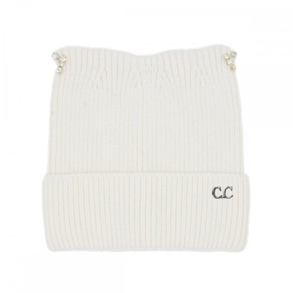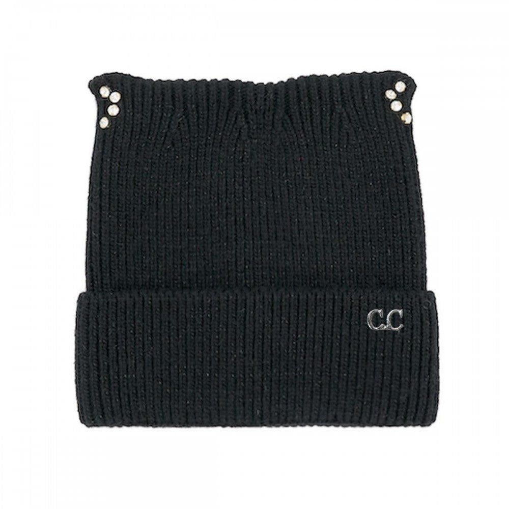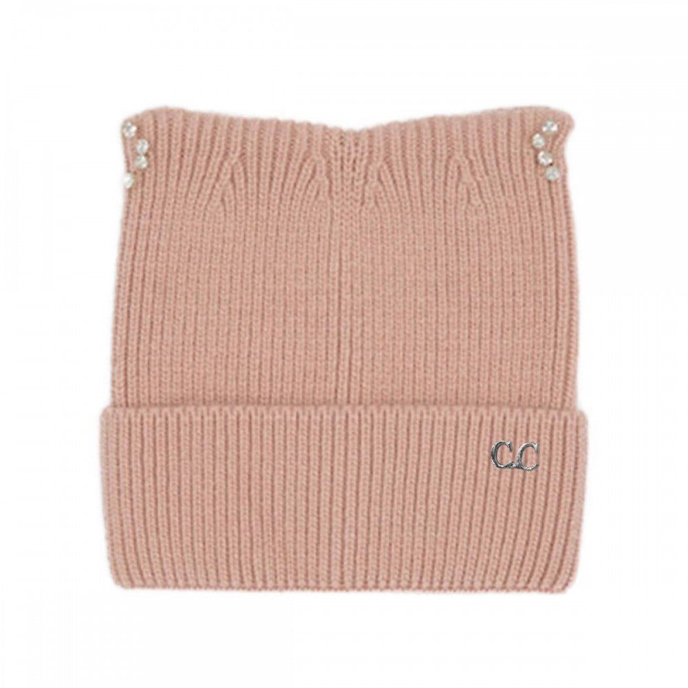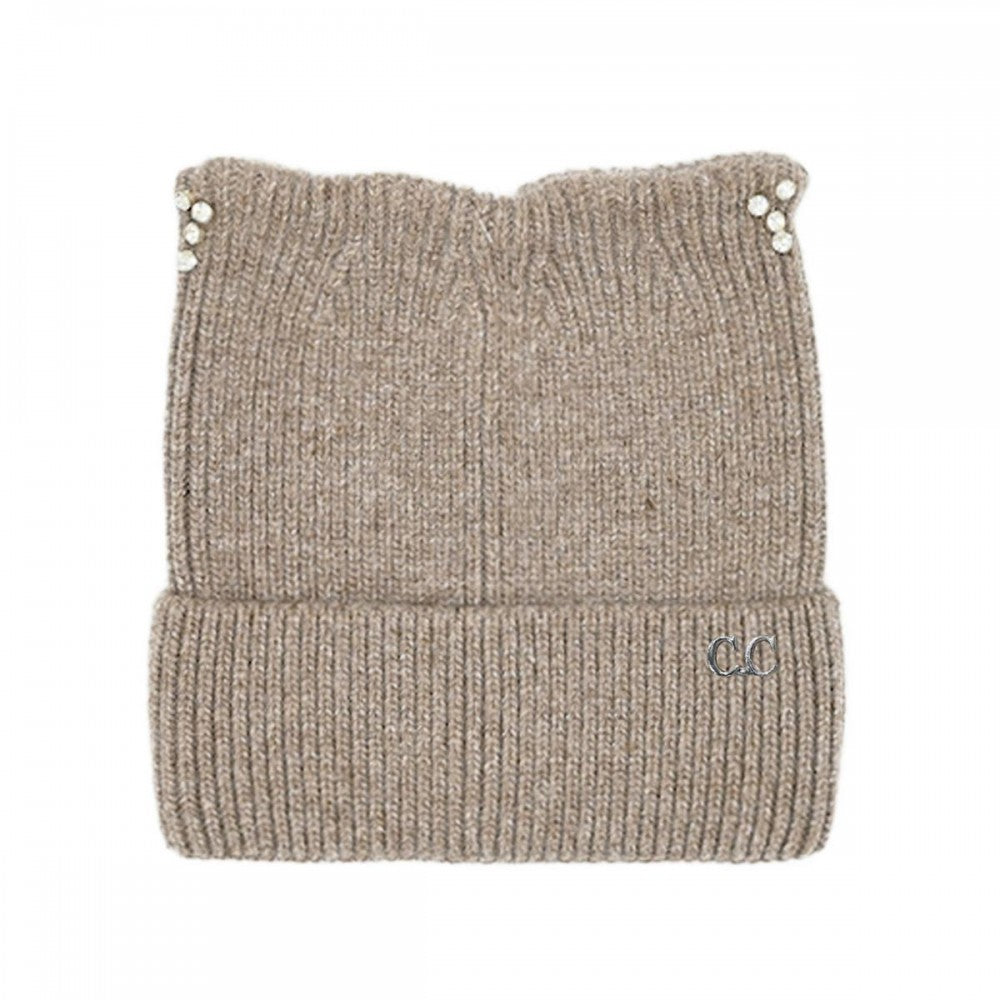 C.C Cable Knit & Tinsel Beanie with Rhinestone Cat Ear Detail – Black, Ivory, Rose, Taupe