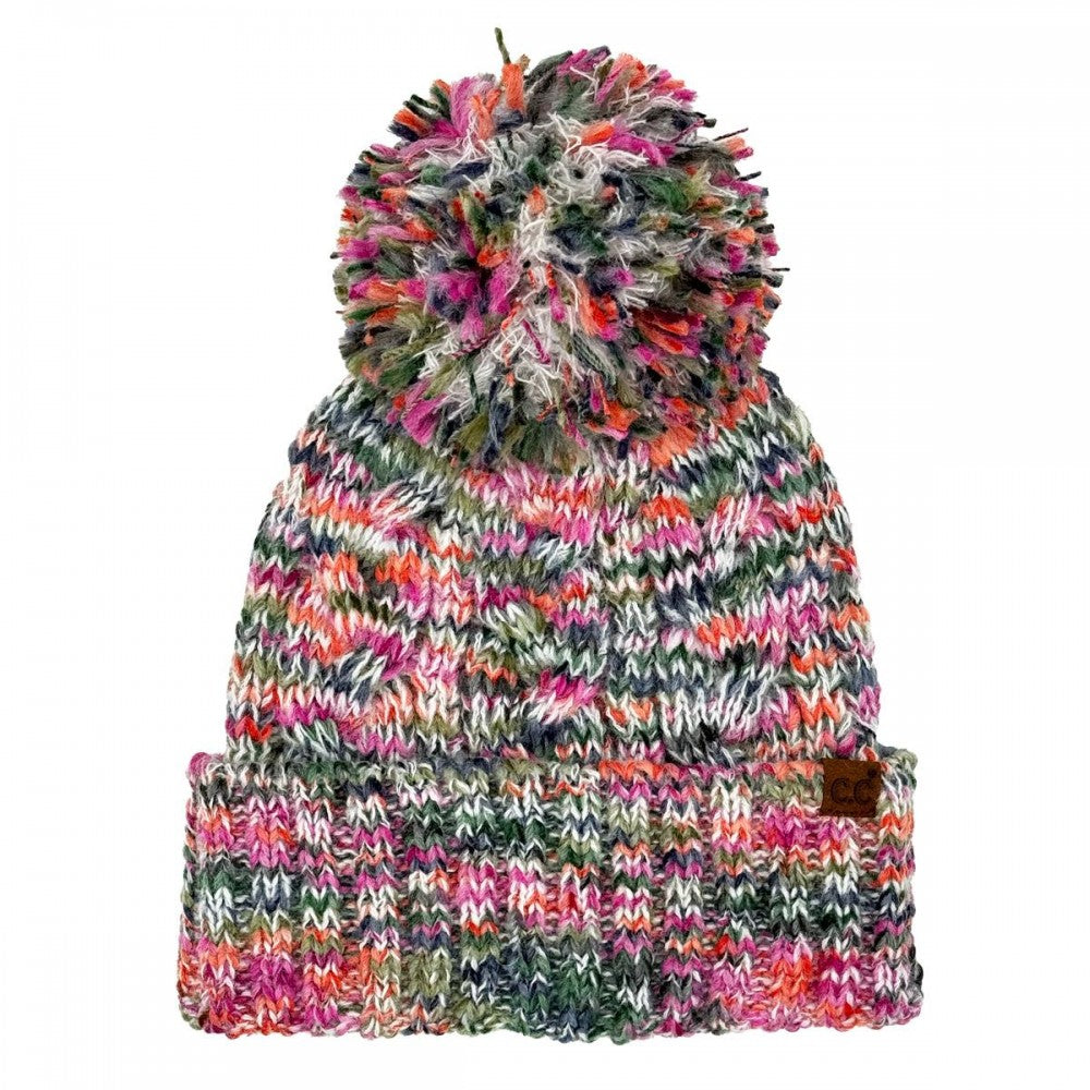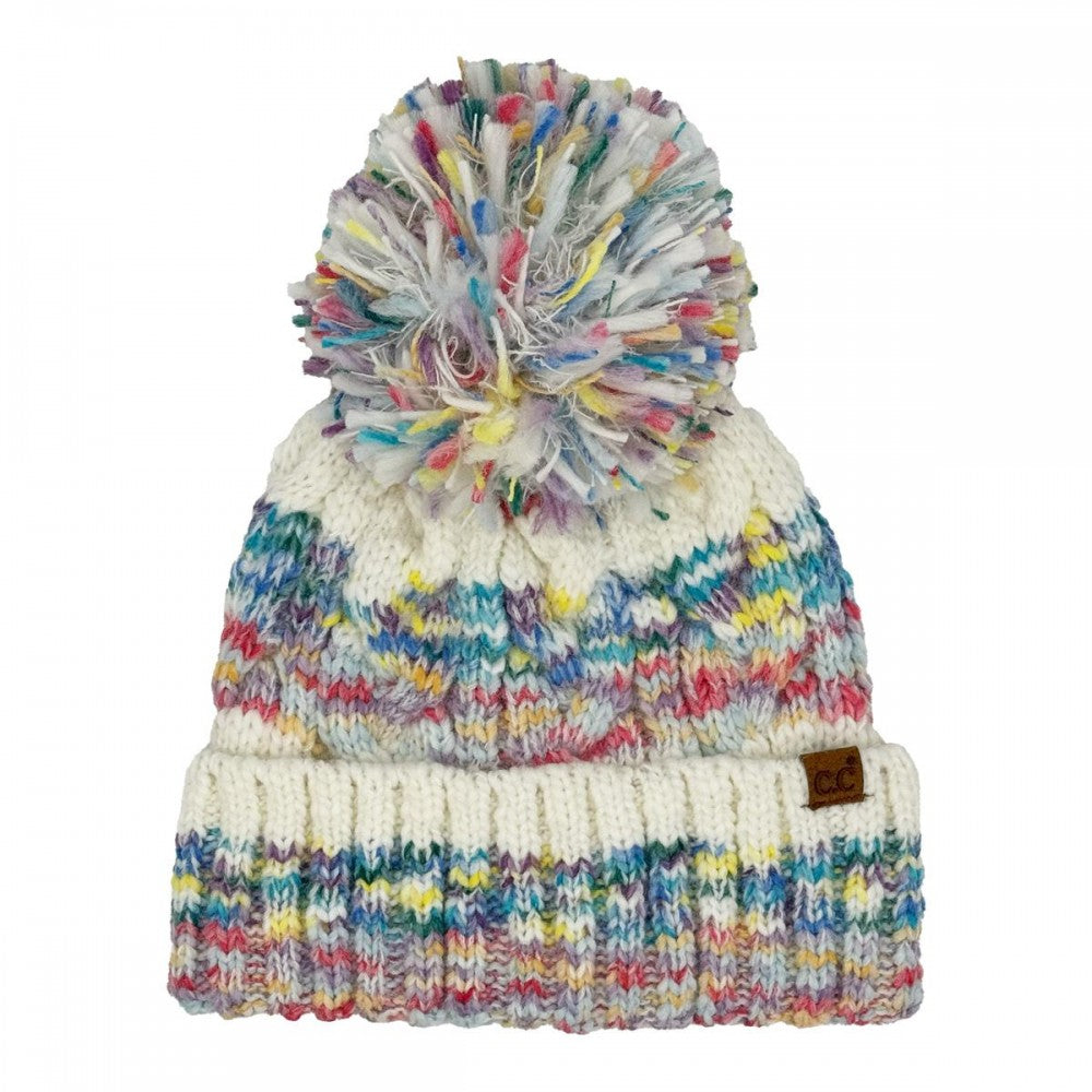 Brighten up cold-weather days with the playful C.C Multi Color Cable Pom Beanie. Featuring a colorful marled cable knit and oversized pom, this beanie combines warmth, comfort, and a fun statement style. Crafted with recycled polyester for a sustainable touch, it’s cozy, soft, and ready to top off your winter look.