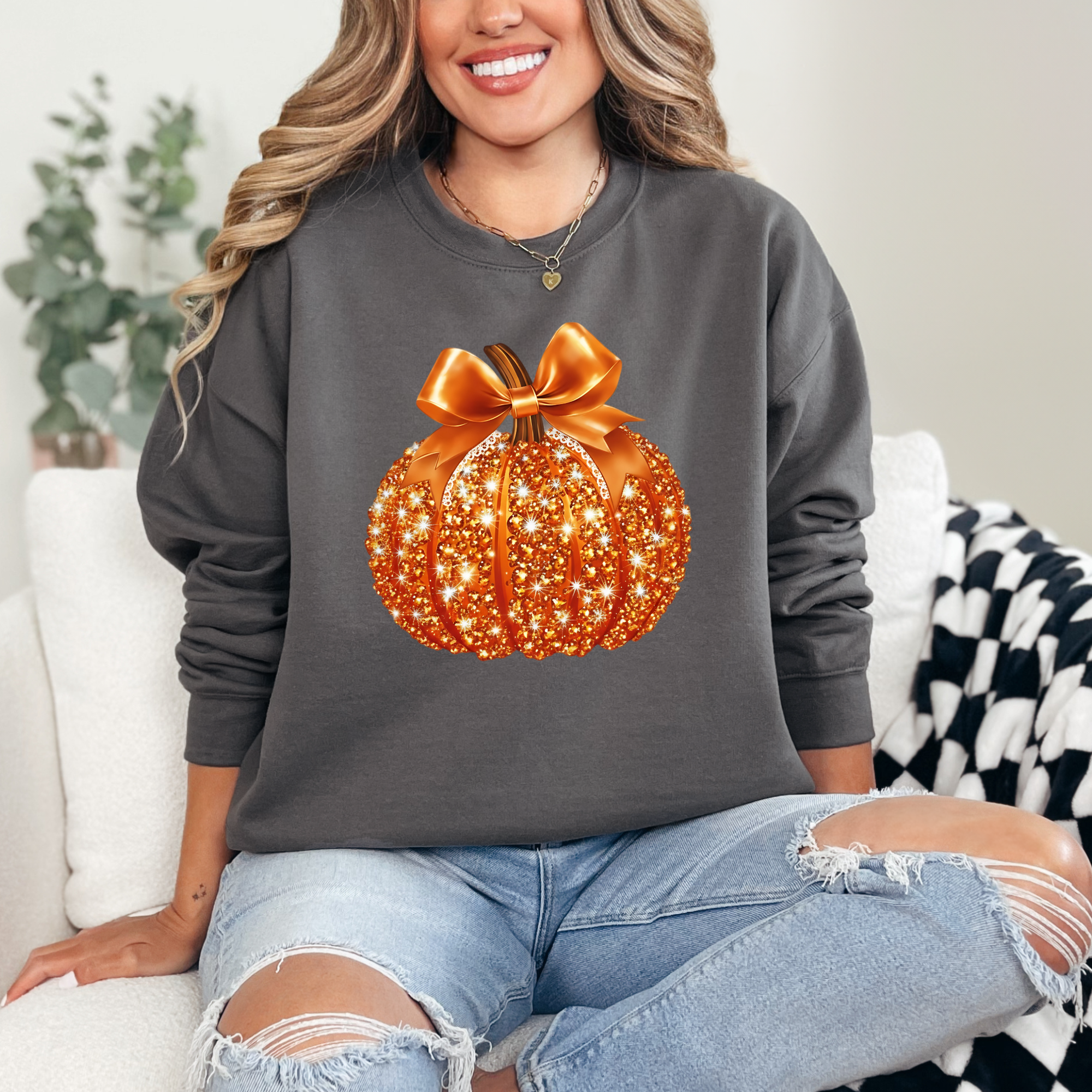 Shine bright this fall with our Glitter Pumpkin Bow Sweatshirt! 🎃✨ Featuring a dazzling orange pumpkin wrapped in sparkling rhinestones and topped with a satin-style bow, this cozy sweatshirt is perfect for adding a little glam to your autumn wardrobe. Soft, comfy, and stylish—it’s ideal for Thanksgiving, fall events, or just showing off your love for pumpkin season in a bold way.