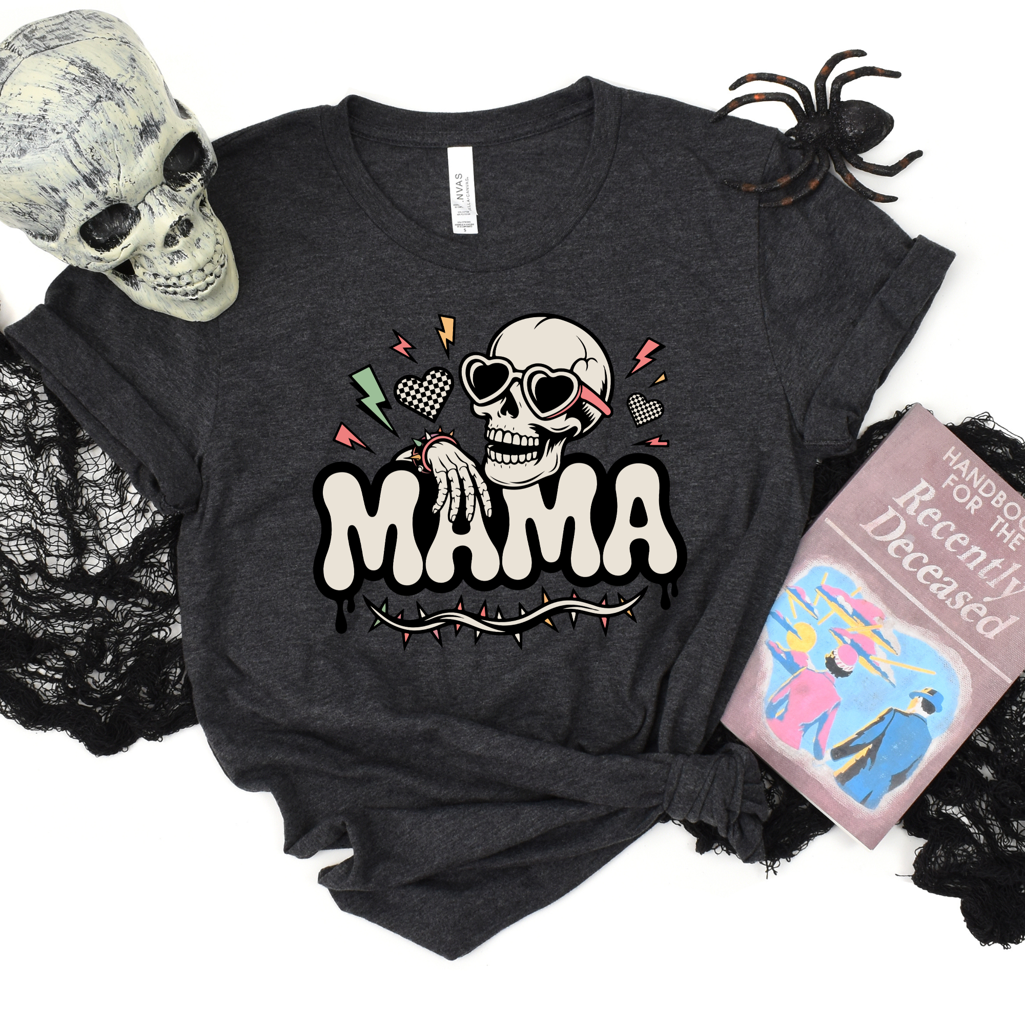 Add some spooky-chic vibes to your wardrobe with this purple Mama Skeleton graphic tee! Featuring a playful skeleton rocking heart-shaped sunglasses and bold retro lettering, this shirt is perfect for Halloween season or year-round edgy style. Made with soft, breathable fabric for a comfy fit you’ll love.