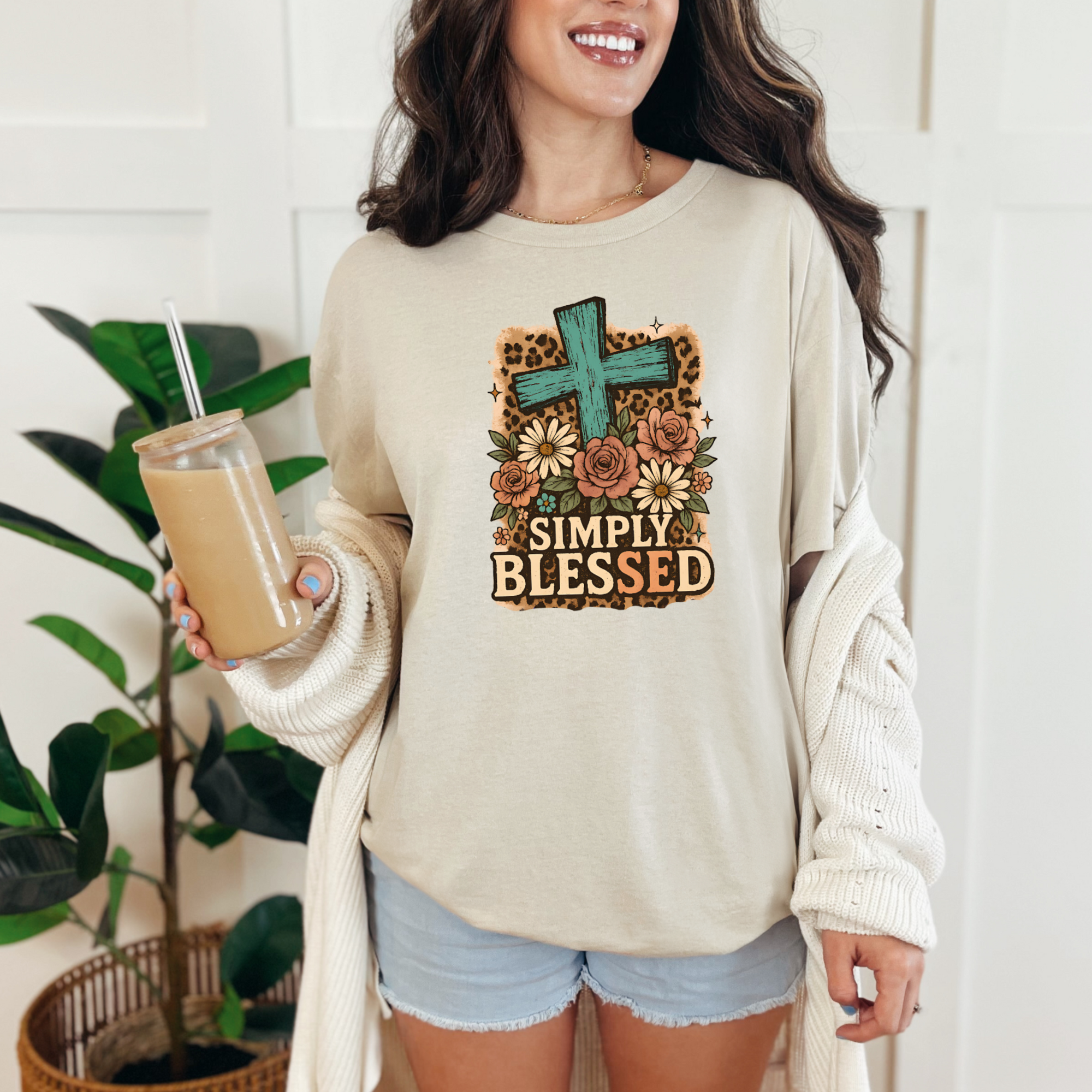 Carry your faith and gratitude with style in this Simply Blessed graphic tee. Featuring a rustic cross with floral accents and a trendy leopard background, this shirt blends inspiration with a touch of boho charm. Soft, comfy, and perfect for everyday wear or casual gatherings.