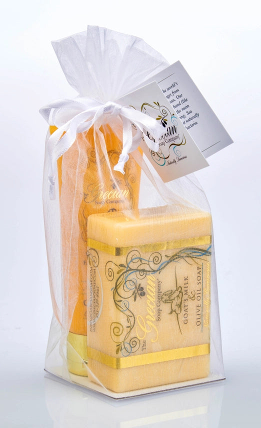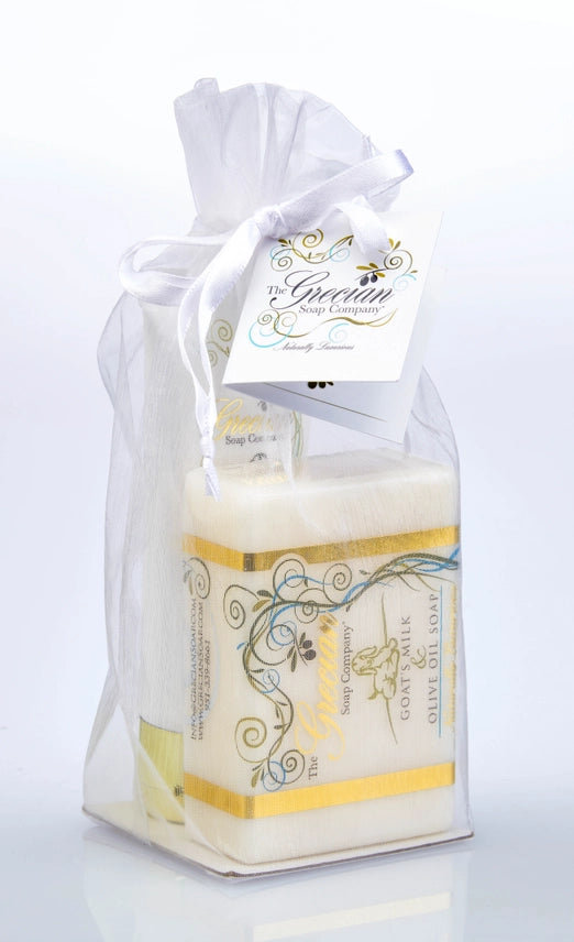 Description: Experience the ultimate moisturizing duo. This beautifully packaged gift set from The Grecian Soap Company features a full-sized 6 oz. goat milk soap bar and a 2 oz. organic goat milk lotion tube. Each set is handcrafted in the USA using premium botanical ingredients to deliver a rich, soothing experience from head to toe.