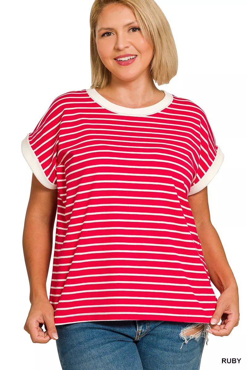 Zenana Contrast Trim Cap Sleeve Stripe Tee β Ruby